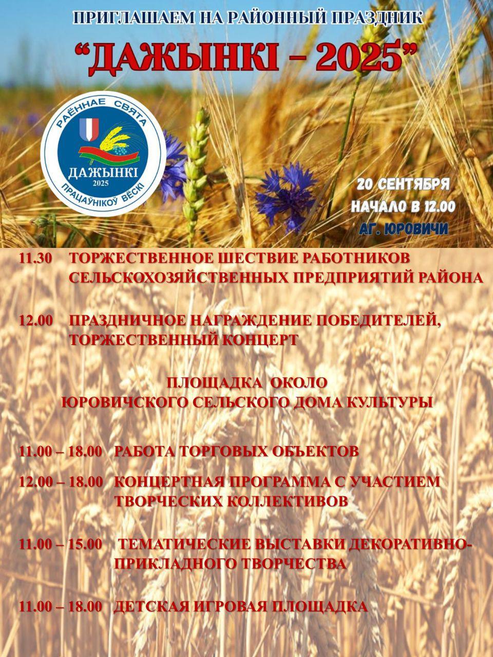 Дажынкі в Калинковичском районеДажынкі в Калинковичском районе в 2025 году пройдут в аг. Юровичи Дата проведения 20 сентября Время начала 12.00