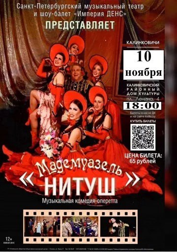 Комедия-оперетта Мадмуазель Нитуш в Калинковичах 10 ноября, начало в 18.00 Стоимость билета: 65 рублей Место: Калинковичский районный дом культуры, пл. Ленина, 4 ...