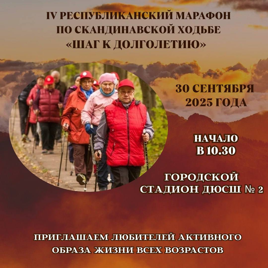 IV Республиканский марафон по скандинавской ходьбе «ШАГ К ДОЛГОЛЕТИЮ»Дата проведения: 30 сентября 2025 годаВремя начала: 10:30Место проведения: Городской стадион ДЮСШ №2Приглашаются любители активного образа жизни всех возрастных категорий. ...