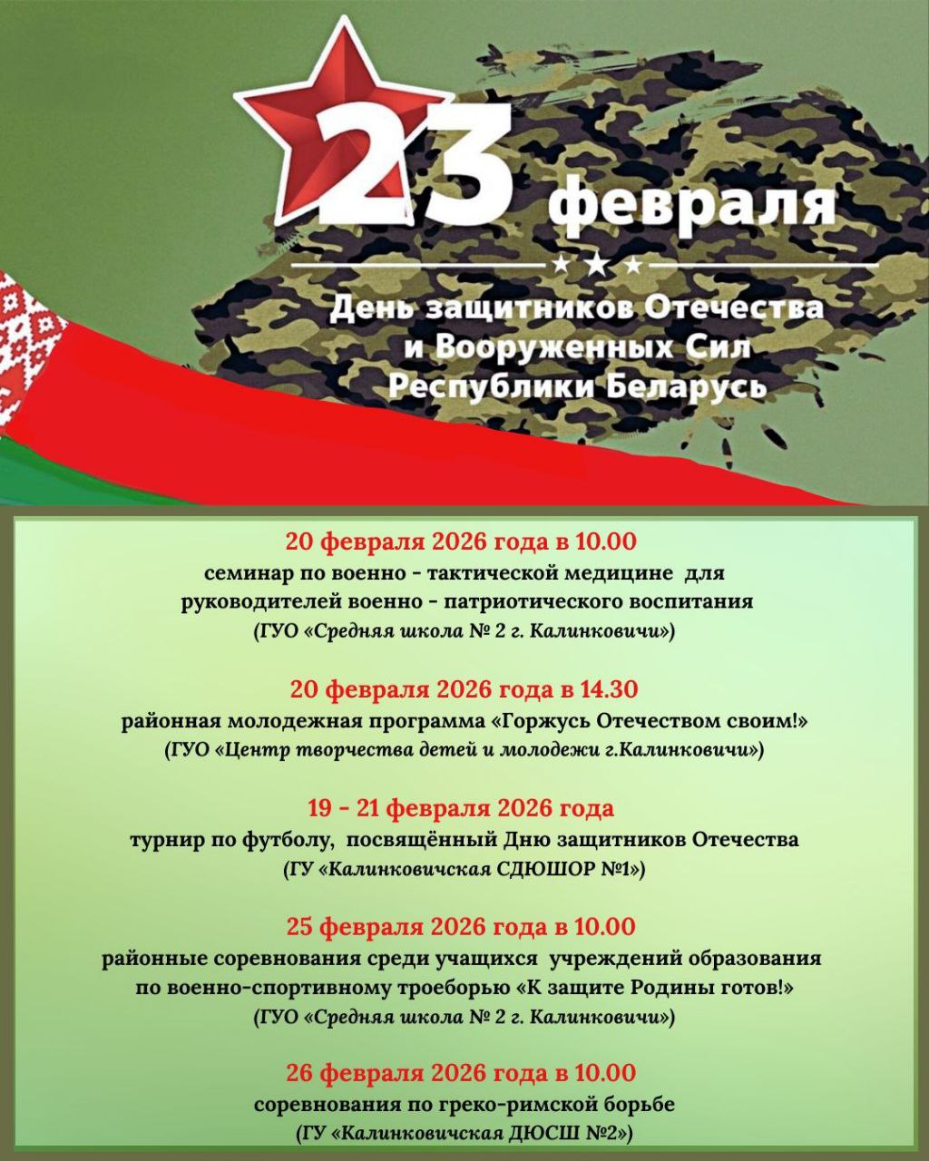 Афиша мероприятий ко Дню защитников Отечества и Вооружённых сил Республики Беларусь. Мероприятия пройдут с 20 по 26 февраля ...